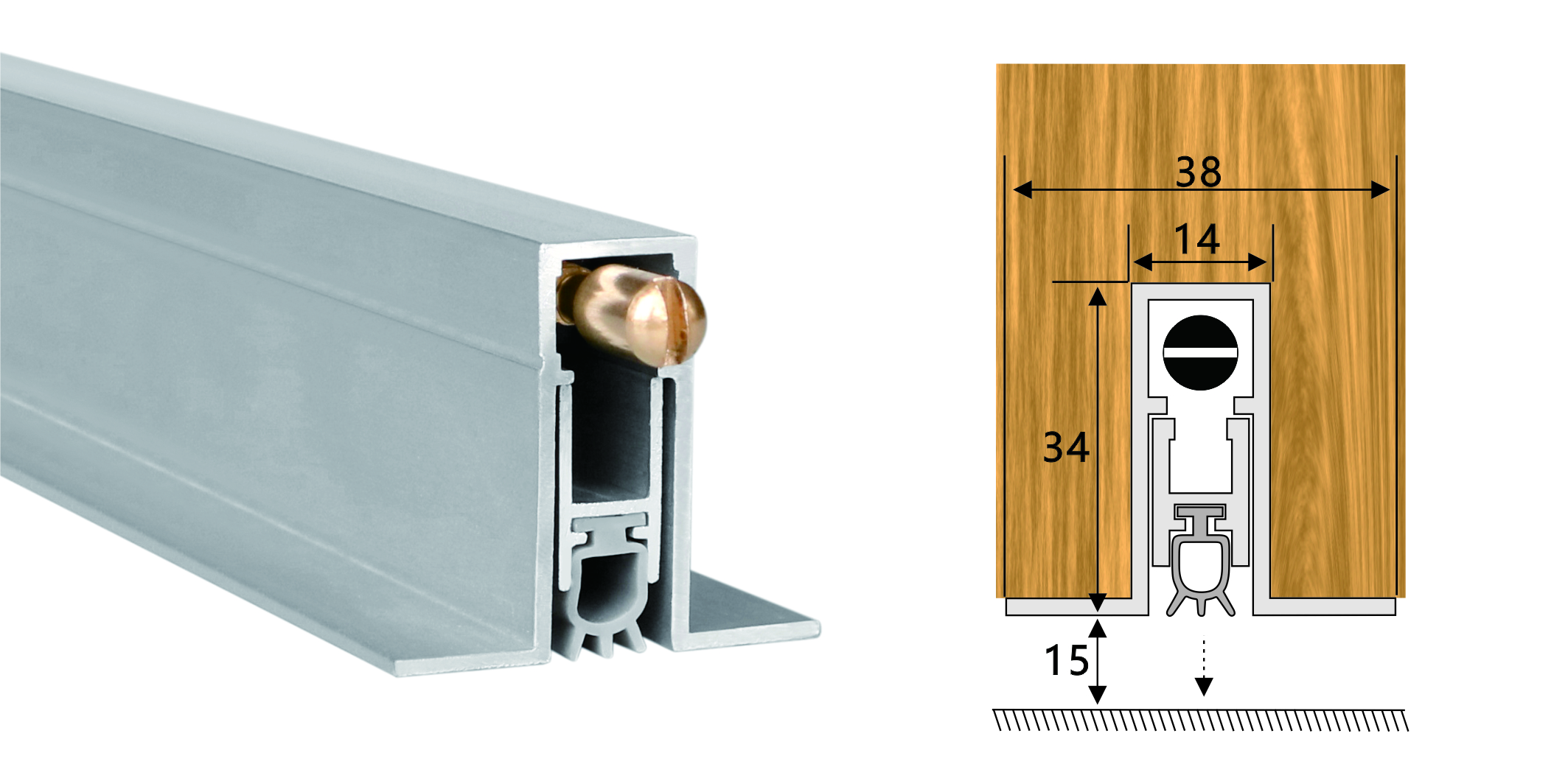 嵌入式門底自動升降式密封器,四連桿機構(gòu),適用于門扇內(nèi)開槽的門。安裝時需在門底有一個34mm*14mm的通槽,將產(chǎn)品放置其中,將兩端蓋板和密封器用螺絲固定(或用螺絲從密封條底部向上固定),使用本產(chǎn)品不影響門的整體風格。