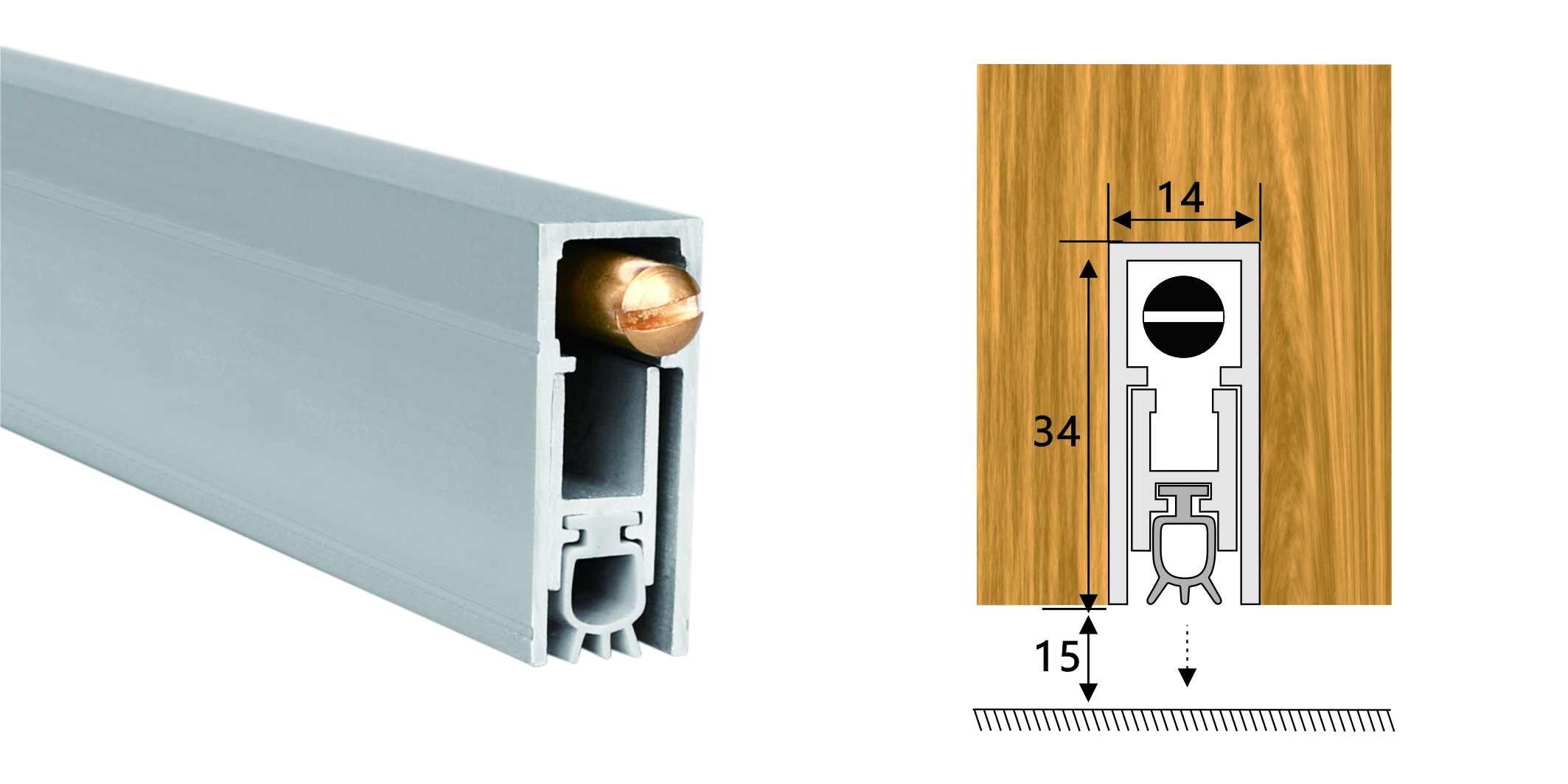 嵌入式門底自動升降式密封器,四連桿機構(gòu),適用于門扇內(nèi)開槽的門。安裝時需在門底有一個34mm*14mm的通槽,將產(chǎn)品放置其中,將兩端蓋板和密封器用螺絲固定(或用螺絲從密封條底部向上固定),使用本產(chǎn)品不影響門的整體風格。