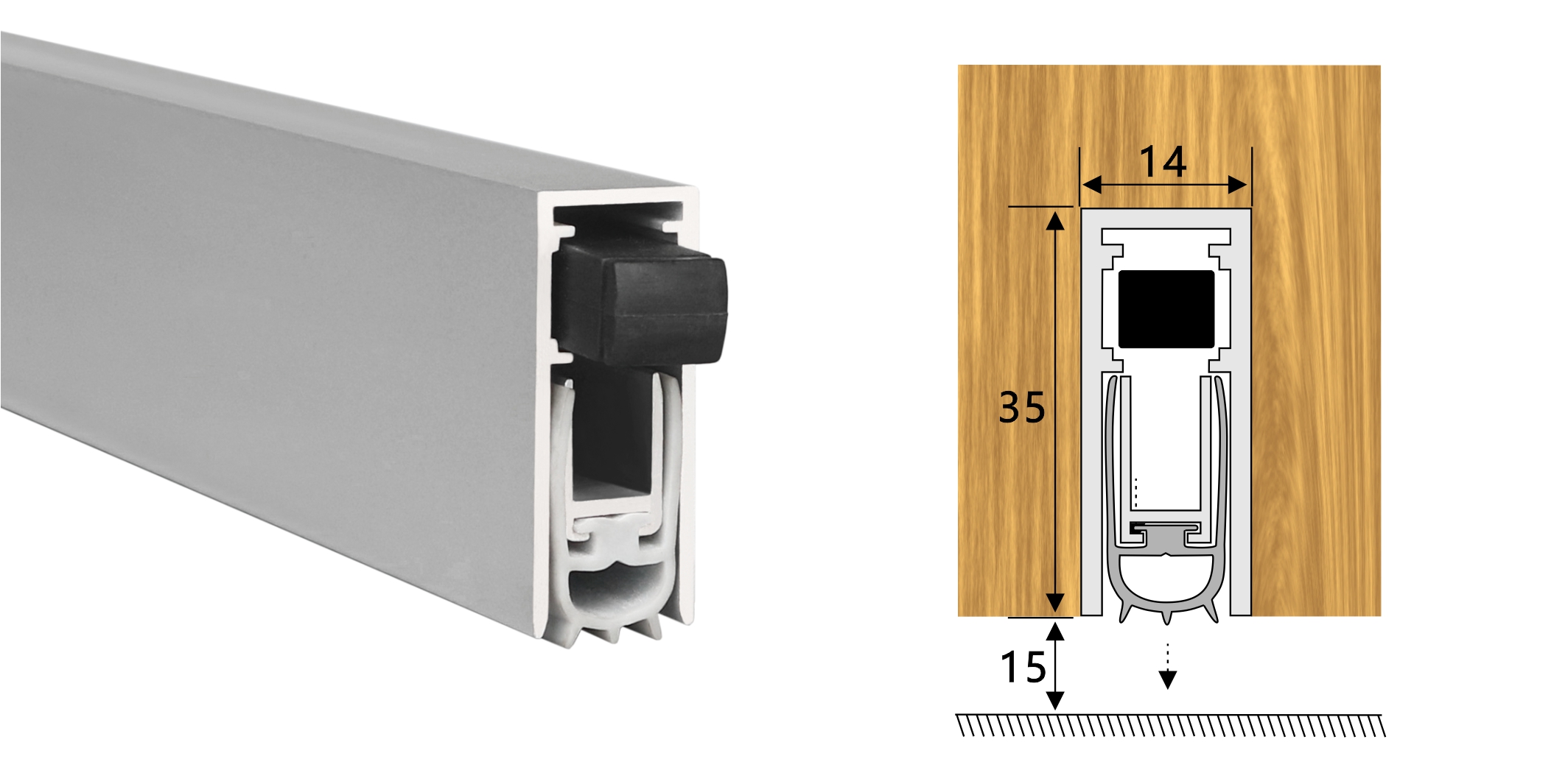 嵌入式門底自動升降式密封器,四連桿機構,適用于門扇內開槽的門。安裝時需在門底加工一條35mm*14mm的通槽,將產(chǎn)品放置其中,將兩端蓋板和密封器用螺絲固定,使用本產(chǎn)品不影響門的整體風格。