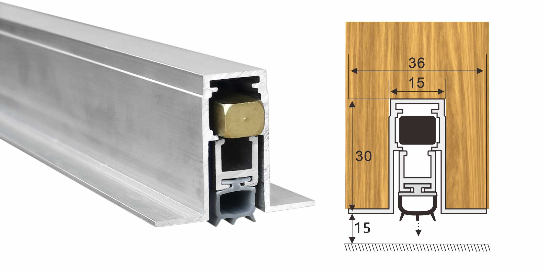 嵌入式門底自動升降式密封器,M型彈簧結(jié)構(gòu),適用于門扇內(nèi)開槽的門。安裝時需在門底有一個30mm*15mm的通槽,將產(chǎn)品放置其中,將兩端蓋板和密封器用螺絲固定,使用本產(chǎn)品不影響門的整體風(fēng)格。